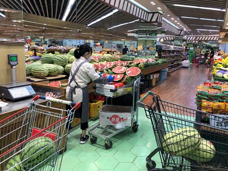 天気が段々涼しくなり、スイカも市場の主役の座から徐々におりつつあります。スーパーにおいては、スイカは現在、1キロ4元前後で、前に比べ値段が下がってきました。下図はスーパーで撮影した北京名物の「大興スイカ」の様子です。また、市内の「果多美」などの果物専門店では、リンゴ、ブドウ、ナツメ、桃などの果物が大量に出回り始めました。もう秋の気配です。