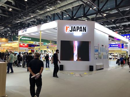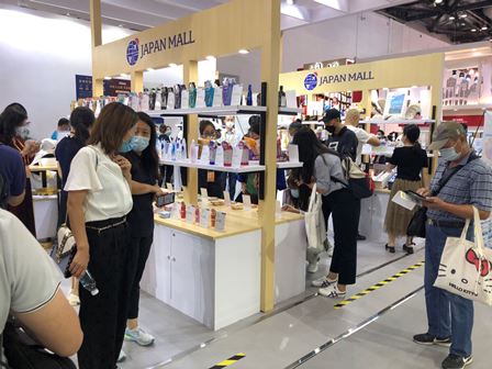 展示会の目立つところに日本館が設置されています。日本の化粧品やお酒、食べ物、陶磁器、マスクのような日常用品等が展示されています。コーセー等の化粧品はとても人気高いようです。