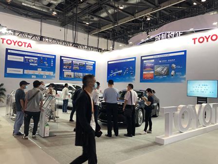 日本館の近くに、TOYOTAの出展ブースがあります。燃料電池自動車の新製品と成果を現場で展示し、多くの来場客の目を集めています。