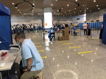 約3時間をかけて厦門空港に到着し、到着後、空港内で直ちにPCR検査を受けなければなりませんでした。PCR検査を受けてからやっと厦門空港から出られました。下図は厦門空港内のPCR検査処の様子です。