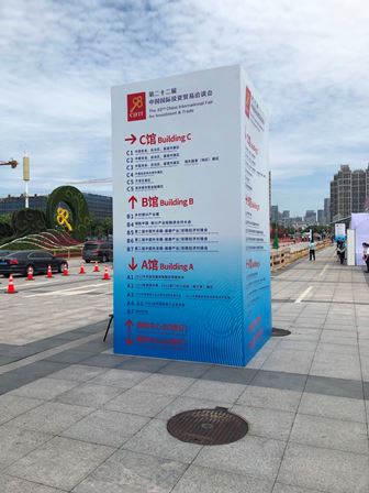 厦門に滞在中、様々なイベントに参加してきましたが、各イベント間の時間を利用し、今回の「第22回中国国際貿易投資商談会」の会場も見学に行きました。今回の「商談会」は9月8日~11日の期間で開催し、4日間で41のフォーラム、50以上の投資説明会が順番に登場し、世界90余りの国と地域より4,000余りの企業が参加したそうです。下図は展示会入り口のところの様子です。