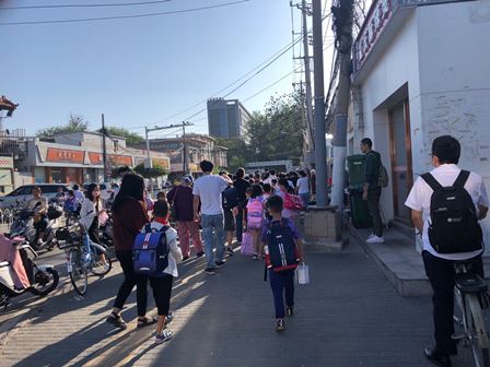 今年は小学校に入学する子供の数のピークなので、この小学校では1年生だけで11のクラスがあり、クラスごとに37名から40名の学生がいます。朝は全学校6学年の学生を対象に、7:50~8:10の20分間が登校の時間帯です。児童があまりにも多いので、朝はこの付近では車の通過は非常に難しく、いつも混んでいます。下図は朝、登校時の様子です。