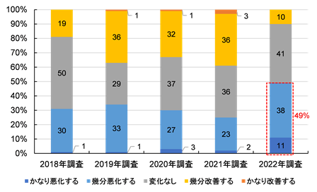 その一方、米中対立長期化が投資にもたらす悪影響に対し、懸念が高まっていることには注視が必要だ。米国でのビジネスにおける問題として、「膠着状態にある米中二国間関係(75%)」「米中経済・貿易関係の摩擦(74%)」との回答が、「コロナの影響(51%)」や「インフレ・不安定な米国経済(61%)」より多かった。また、今後の米中関係の悪化を見込むと回答した企業は約半数(49%)にのぼり、改善を見込む企業は10%と2018年以来最低の割合となった(図表2)。本調査は、米中対立により、先端分野への投資抑制のほか、中国ブランドへの信用力低下や、米国側の複雑な規制に対応するためのコンプライアンス業務増加などが在米中国企業のビジネスの障害となっていることも示した。こうした問題の長期化による、中国企業の投資停滞が懸念される。