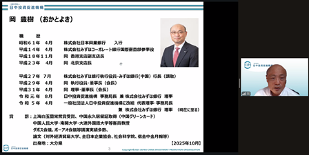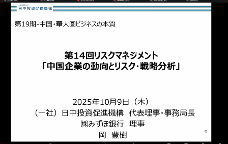 2025年10月9日(木)、NPO法人香港協会・二松学舎大学主催「第19期 華人経営研究講座」の公開講義に岡事務局長が登壇し、「中国企業の台頭とリスク分析 ~中国市場や中国企業の動向から日本企業事業戦略やチャイナリスクを考える」をテーマに香港協会会員の皆様(約60名)向けに講演しました。