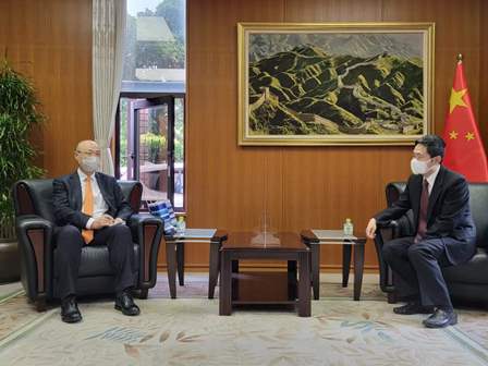 5月19日(木)当機構・岡事務局長は駐福岡総領事館を表敬訪問の上、律桂軍総領事との面談を行いました。岡事務局長は今回、翌20日に開催される「中国蘇州・日本九州経済協力交流会」への登壇の為福岡入りしたもので久しぶりの直接面談となりました。本年は福岡県と江蘇省の友好姉妹都市30年、日中国交正常化50周年の節目の年となります。律総領事からは冒頭翌日のイベント登壇への御礼をいただき、その後は日中共通の利益に対し揚子江デルタを中心に蘇州との連携への期待、ゼロコロナ政策、産業サプライチェーンの充実、経済成長の下支えとなる財政投資、国内と海外のダブル循環などにつき意見交換を行い、福岡総領事館と当機構との緊密な連携に向け対話を継続する事といたしました。