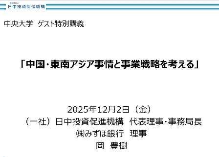 2025年12月2日(火)、中央大学のゲスト特別講義に弊機構の岡事務局長が登壇し、「中国・東南アジア事情と事業戦略を考える」をテーマに学生向けに講演しました。