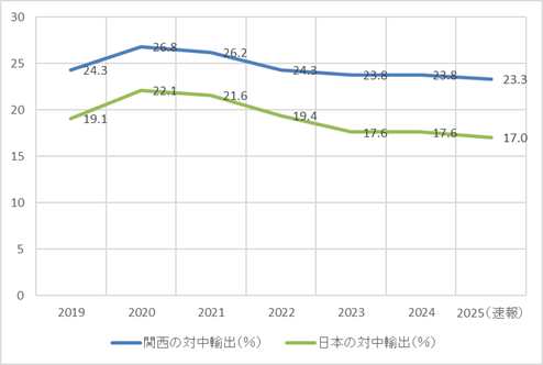 図1 日本全体と関西の世界への輸出における対中輸出割合の推移